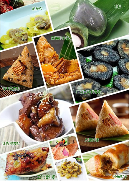 如今的粽子更是多種多樣,璀璨紛呈?,F(xiàn)今各地的粽子,一般都用箬殼包糯米,但內(nèi)含的花色則根據(jù)各地特產(chǎn)和風(fēng)俗而定,著名的有桂圓粽、肉粽、水晶粽、蓮蓉粽、蜜餞粽、板栗粽、辣粽、酸菜粽、火腿粽、咸蛋粽等等。