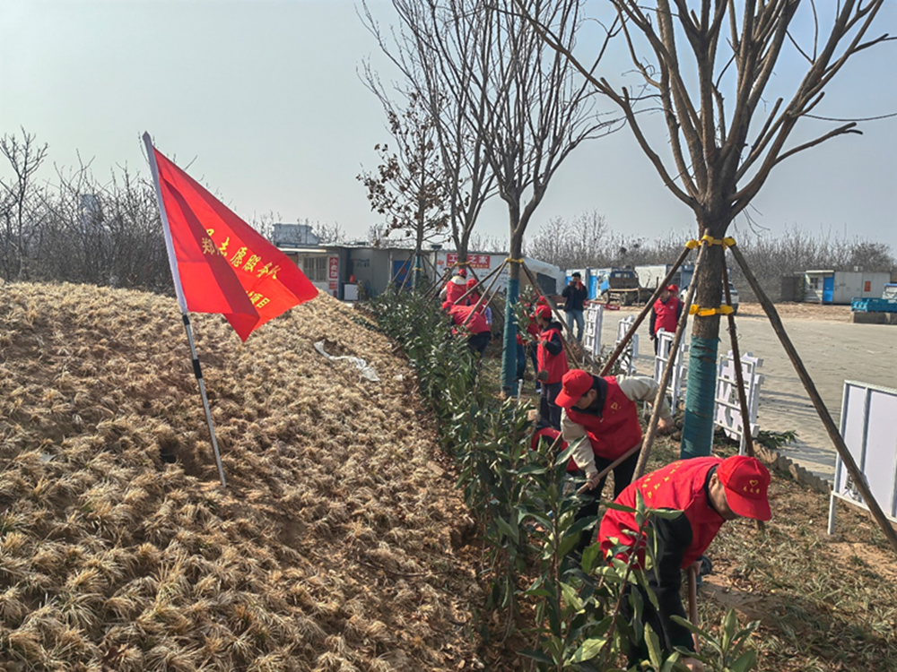 黨員志愿服務(wù)隊(duì)人員分工明確,配合默契。挖坑、搬運(yùn)、植樹、培土澆水,井井有條,忙而不亂。在志愿者的共同努力下,細(xì)心栽下碧綠的樹苗,在暖暖的陽(yáng)光下格外顯眼,仿佛為項(xiàng)目披上一層新裝。