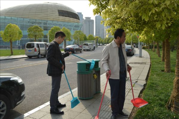 顧不上欣賞春光明媚、水靜人和的美景,碧波蕩漾的如意湖畔出現(xiàn)了建投志愿者服務(wù)隊的身影,大家拿起掃帚、垃圾袋等工具一路前行,看見沿岸偶爾零散的垃圾或不易發(fā)現(xiàn)的紙屑便主動上前進(jìn)行清理,很快,如意湖周邊的石柱、圍欄、長椅就煥然一新,廣場周邊散落的紙屑、煙頭也被清掃干凈。